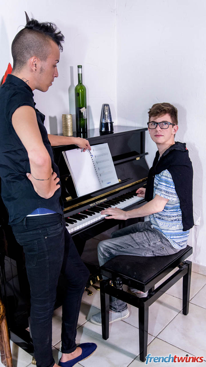 Abel Lacourt se fait baiser par son prof de piano particulier Kevin Ventura. Abel Lacourt est effectivement plus doué pour la fellation que pour le piano et Kevin se fait sucer longuement en gémissant de bonheur avant de retourner le bel éphèbe pour écarter son cul, lécher et doigter son petit trou. Abel se tortille de plaisir et son anus se dilate progressivement sous les coups de langues. Lorsque Kevin sent qu’Abel Lacourt est prêt à encaisser sa queue dure comme du bois, il se redresse et commence à pénétrer le minet. Abel se fait baiser à quatre pattes sur le tabouret de piano et vient ensuite s’empaler sur la bite de Kevin dans une chevauchée passionnée qui mènera nos deux jeunes français à la jouissance. Kevin envoi une impressionnante quantité de sperme sur le visage d’Abel Lacourt qui jouit à son tour quelques secondes après, encore couvert de foutre.