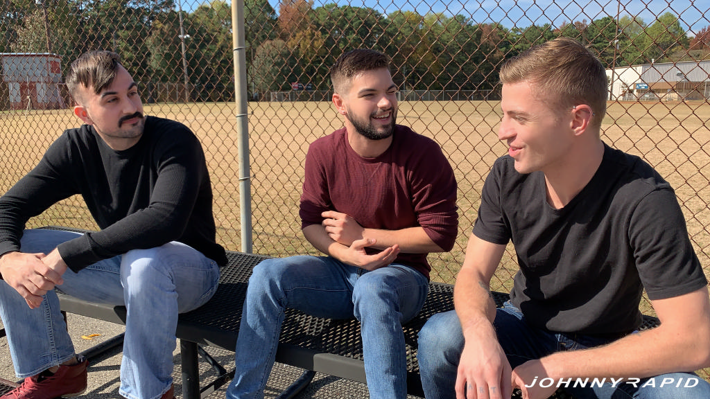Johnny Rapid has been promised some fun at the park, and he’s joined by sexy gymnasts Mason Lear and Tom Bentley. After Johnny demonstrates that he can hold his own in the athletic department when it comes to walking on his hands, they head back to Johnny’s office for an acrobatic threesome. Tom does a naked handstand split on the desk that makes Johnny’s mouth water, so he has to eat that hole. Soon he’s fucking Tom’s tight ass as Tom deepthroats Mason. Once the guys have Tom loosened up a little, they DP that ass, and then it’s Johnny’s turn to get his hole stretched by two big cocks at once!