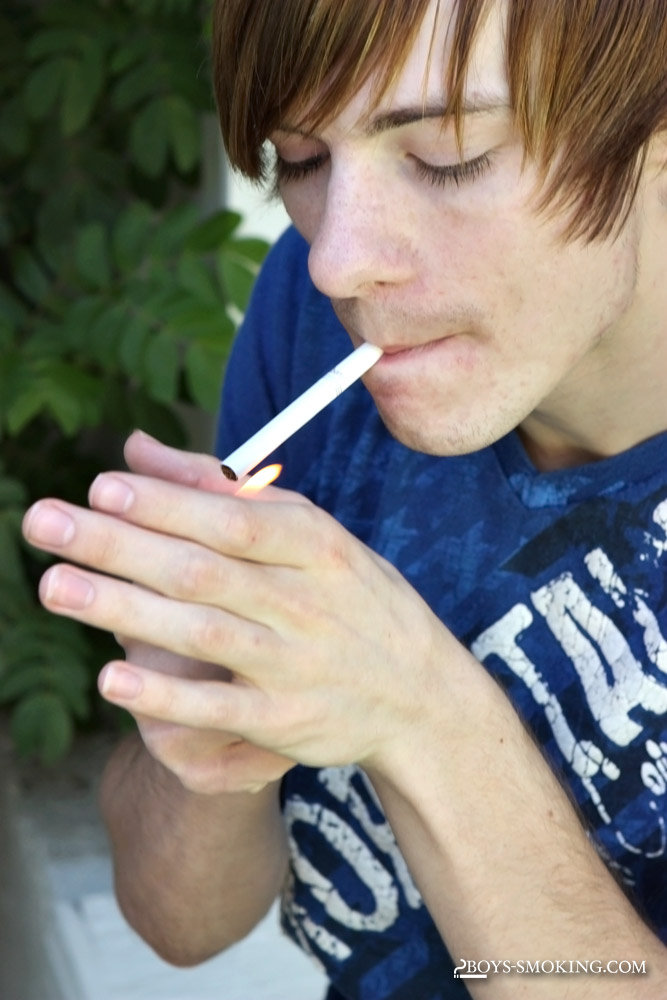 Shy chainsmoking twink Ash lights up and jerks his cock outside in the backyard until he unloads all over his six pack!