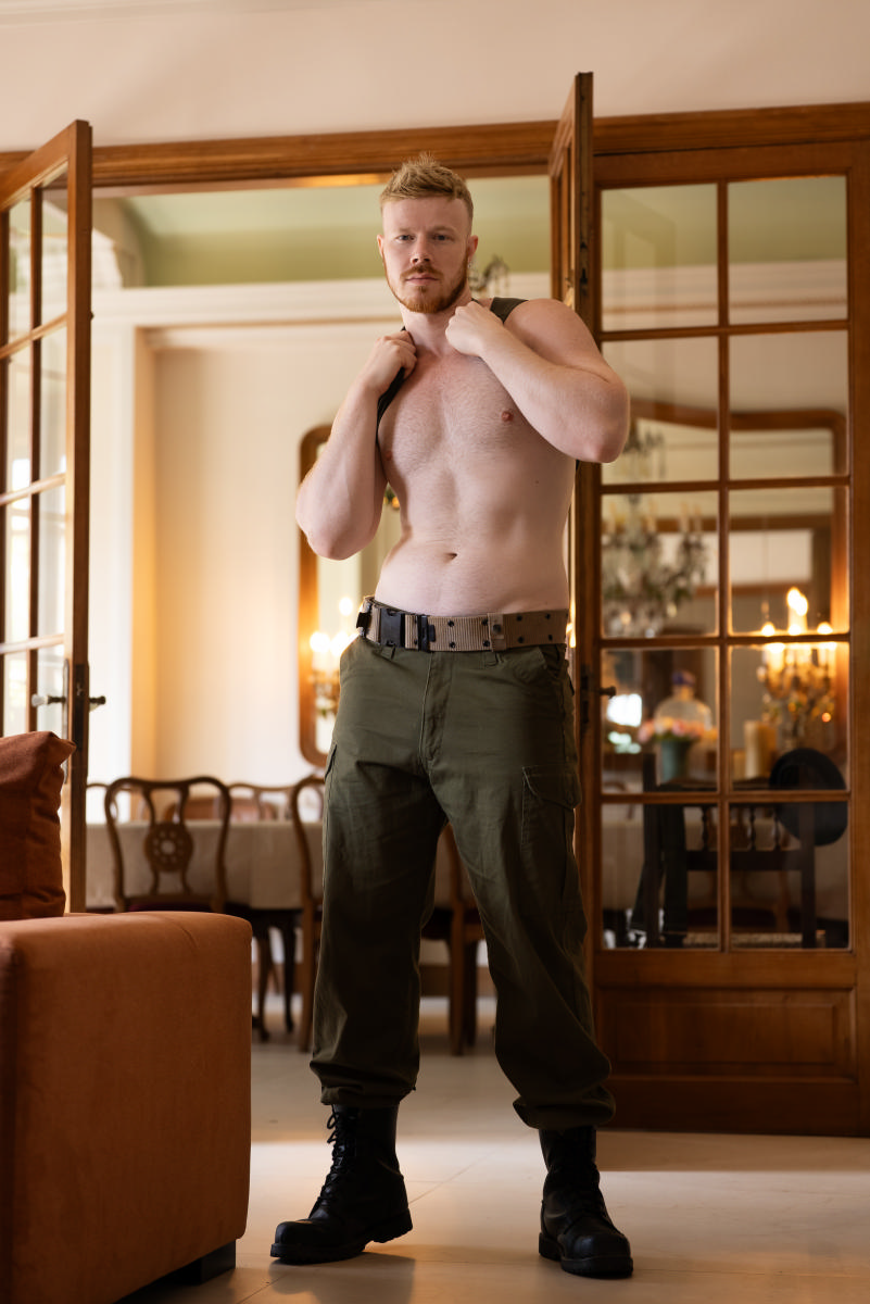 Sensitive and secretly gay, Eliott (John Jai) never thought he might be welcome in the army, until he watched two sets of soldiers fuck in front of his very eyes! He hesitantly asks the Captain (Ander the Viking) about it, and the officer understands what John is really asking. The men take a walk in the garden, and Eliott finally gets what he’s been yearning for as the Captain kisses and undresses him. He sucks the bearded top, then the officer bends him over to tongue his hole and finally slides his cock inside. Eliott is thrilled as the sexy solder fucks him on his back until he cums and takes a facial… but outside, the war still rages.