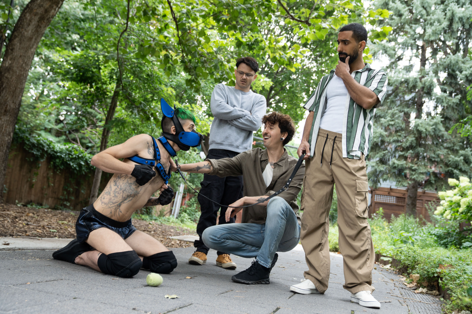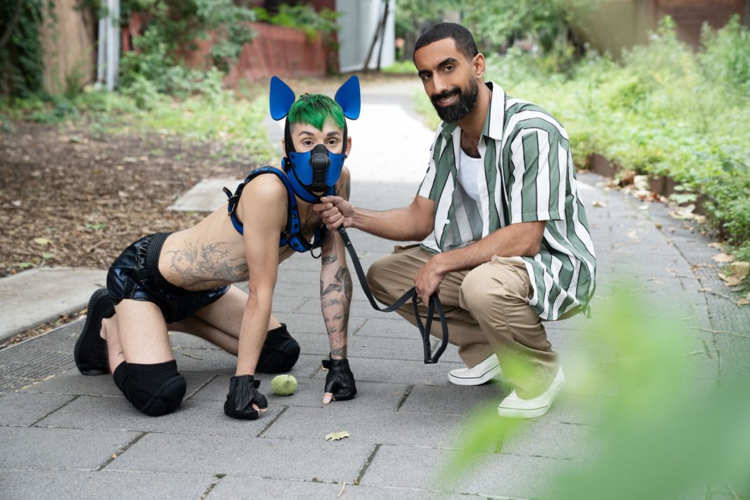 Ali Rush was just walking down the street when a gray-haired daddy pushed a leash into his hand and ran off! Masked and leashed bottom Charly Willinsky wants to play with Ali’s bone. Passers-by pet the well-behaved sub, and when Charly tells Ali his master probably isn’t coming back, Ali takes him home. Charly begs for Ali’s cock and sucks him in his mask, then gets fucked doggystyle on the couch. Charly rides Ali till he orgasms, then takes the top’s load on his face. Ali wants to keep him for good, but Charly’s gotta just keep moving on.