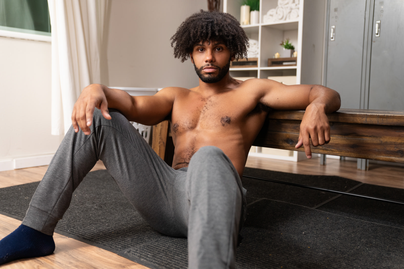 Joey Mills and Tony Genius’s big packages bounce in their gray sweats as they stretch and do their workout. The guys get changed in the locker room, and Tony checks out Joey’s ass in his jock strap and starts touching it. Joey sucks the top, and Tony tongues Joey’s hole, then eases his cock inside before the bottom rides him on the bench. The top flips Joey onto his back, then fucks him in piledriver till the bottom cums, and Tony finishes with a creampie.