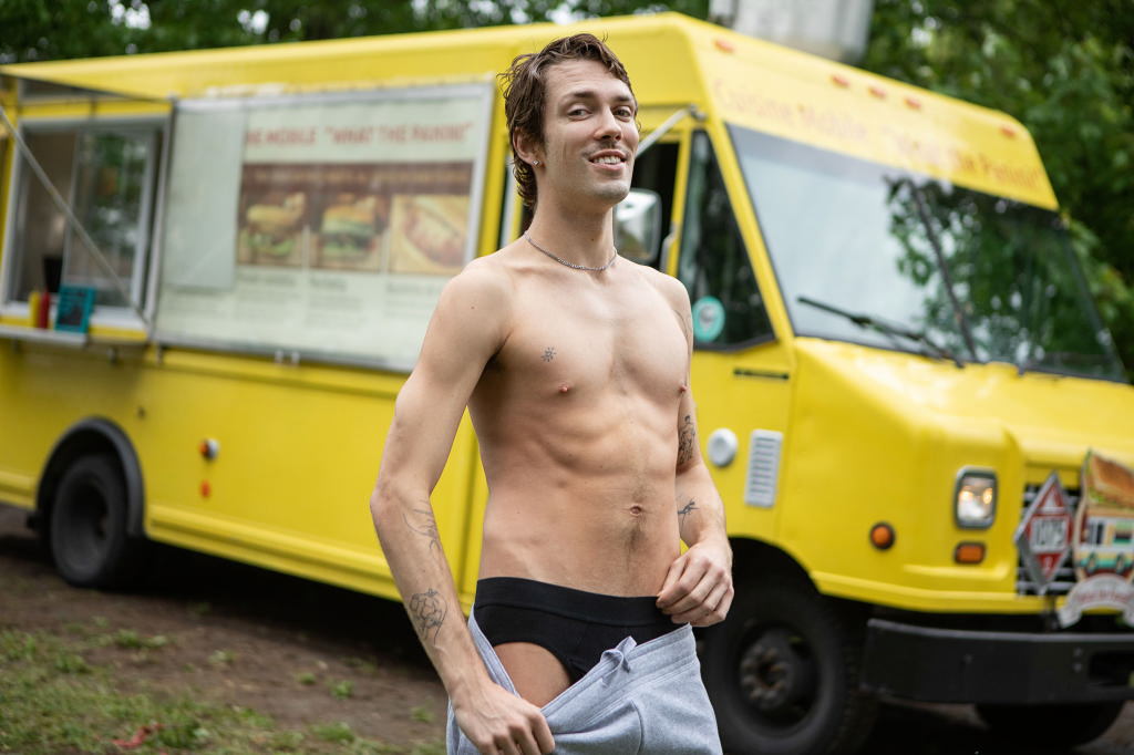 Chris Cool is a regular at Finn Harding’s food truck, and not for the hot dogs. As Chris’s flirting starts interfering with business, Finn invites him inside so they can work and play at the same time. Chris tries to take orders as Finn rims him, but he’s not a people person… he’s a cocky person, so he sucks Finn as the top works. Finn bends Chris over to fuck him doggystyle as Chris mans the window, then pounds the bottom on the counter. Chris takes Finn’s big sausage in his buns till he cums, then puts the top’s dick in a bun and takes some special sauce on his face.