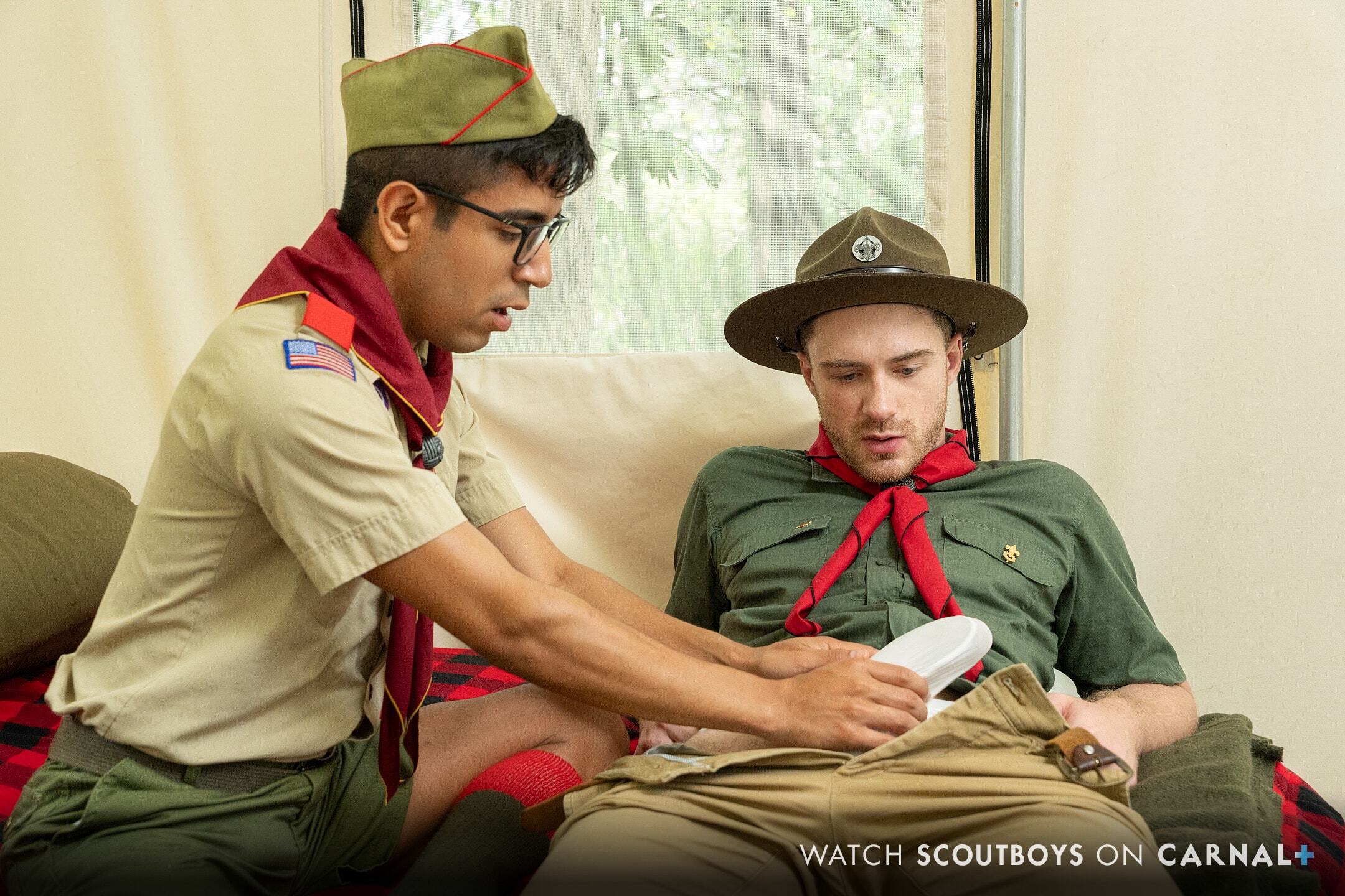 As Cole remained leaning back, his legs spread wide and open, he let the younger scout know that he wasn’t shy about Milo exploring. With scout Cole’s pants being so tight, leaving nothing to the imagination, it was fairly obvious when Milo’s touches elicited a reaction from Cole’s erection. A reaction both boys were hoping for!