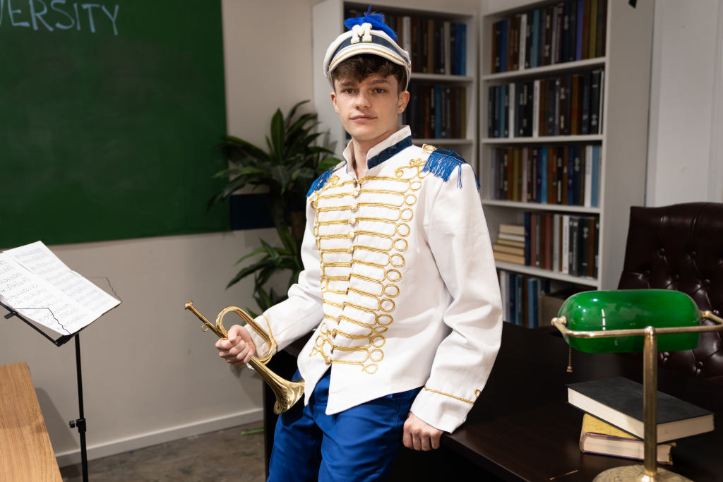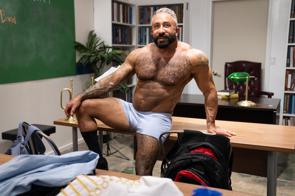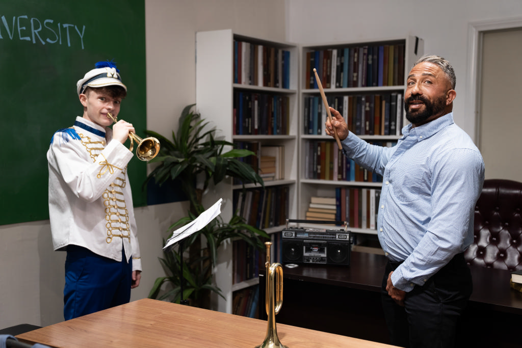Marching band geek Jake Preston is nervous for his meeting with the band teacher after he blew his solo, so he calms down with some joke selfies, like pretending he’s fucking his trumpet. One thing leads to another, and professor Ken Rock comes in to find Jake with his hard dick in his hand! Ken tells Jake to put it away and play for him, but Jake can’t concentrate when the professor bends over. Ken goes into the storage room and sticks his cock through a hole in the wall, and Jake eagerly blows it, then gets sucked by his teacher! Jake licks Mr. Rock’s hole and penetrates him over his desk, then fucks his throat before drilling him on his back and in spoon. Ken cums as the band geek fucks him from behind, then takes a facial.