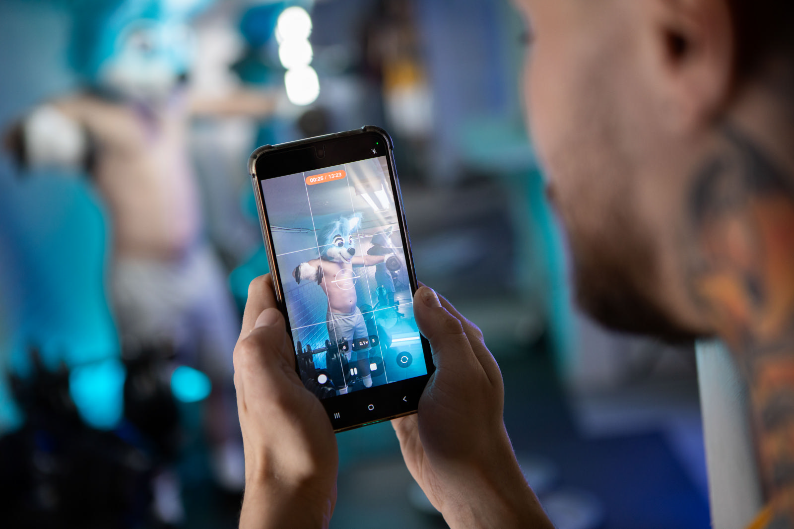 Marcus McNeill booked a session in the private gym, but not to work out. He sets up his camera and puts on his fursuit head and gloves, then flexes and poses with the weights. That’s when Chad Dorado arrives a little early for his gym slot and sneakily films the muscular furry. Marcus catches him and tells him to delete the video, but after Chad compliments his hot physique, he lets the tattooed bottom suck him, then drills him in doggystyle. Chad rides the sexy top and gets fucked on his side, then strokes himself till he orgasms while Marcus pounds him on his back. Marcus jacks off with his furry glove and cums into Chad’s mouth.