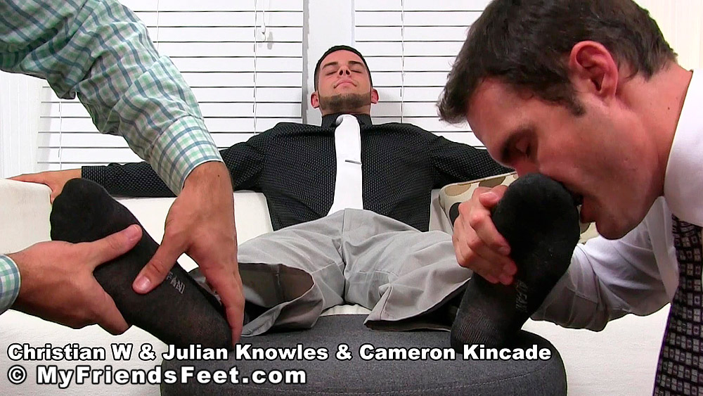 Christian is the new guy at work and to initiate him into the ‘group’ Julian and Cameron coerced him into a back room where they could take advantage of worshiping his feet. They certainly wasted no time getting to it!