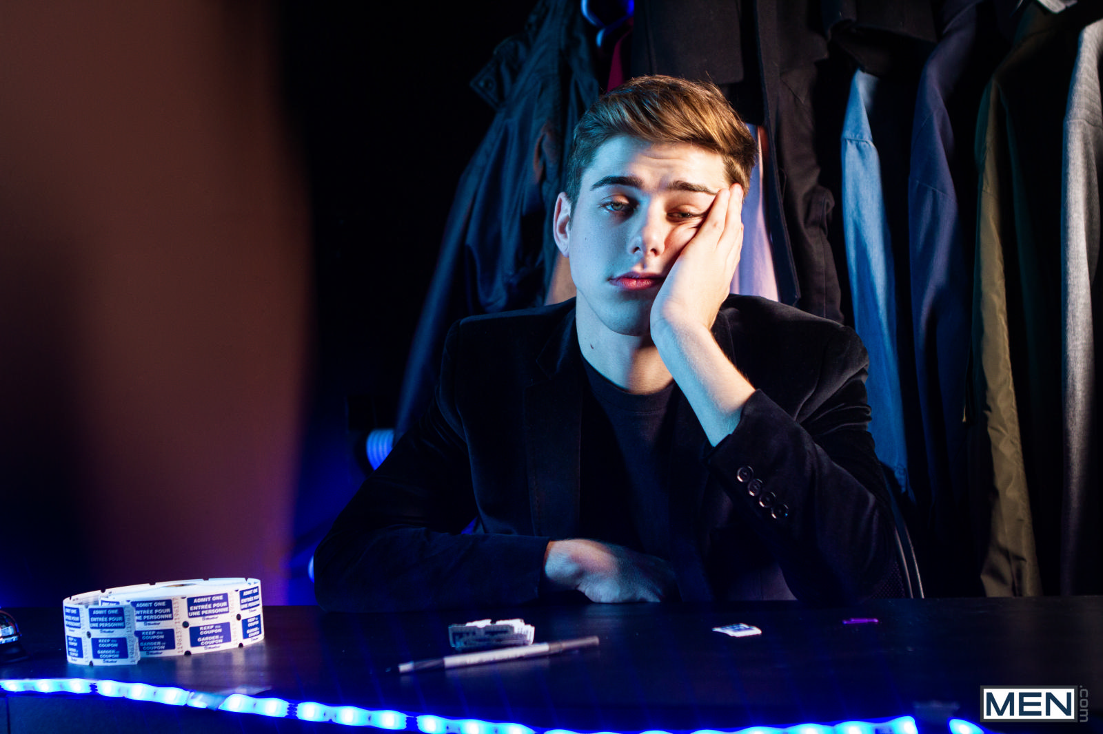 Coat check guy Joey Mills is bored and the coast is clear, so he gets out his cock and starts stroking it. Joey gets so into his self-pleasure that he doesn’t even notice as William Seed approaches, and William Seed quietly enjoys the show! When Joey finally looks up and sees the muscular French stud taking him in, William Seed gets out his own dick and hops over the counter to feed it to the pretty twink. While Joey has his hands–and mouth–full, William helps out a customer before taking Joey in the back to bend him over and fuck that ass. Joey cums hard and William Seed gives the twink a facial.
