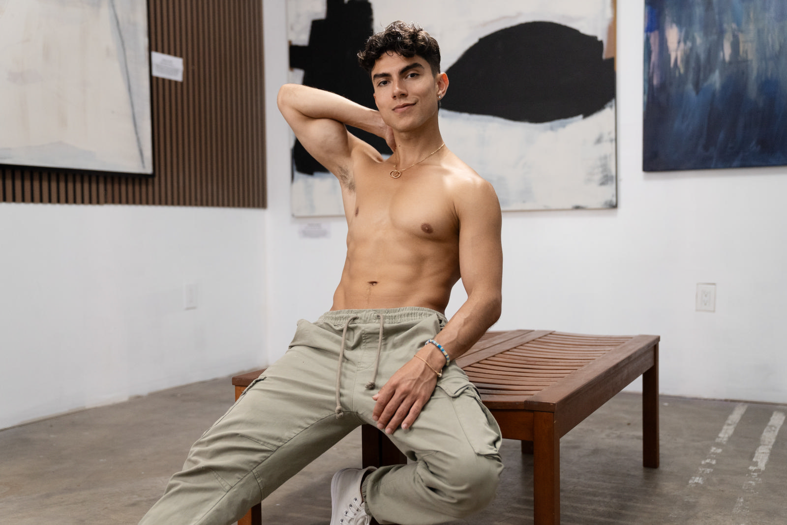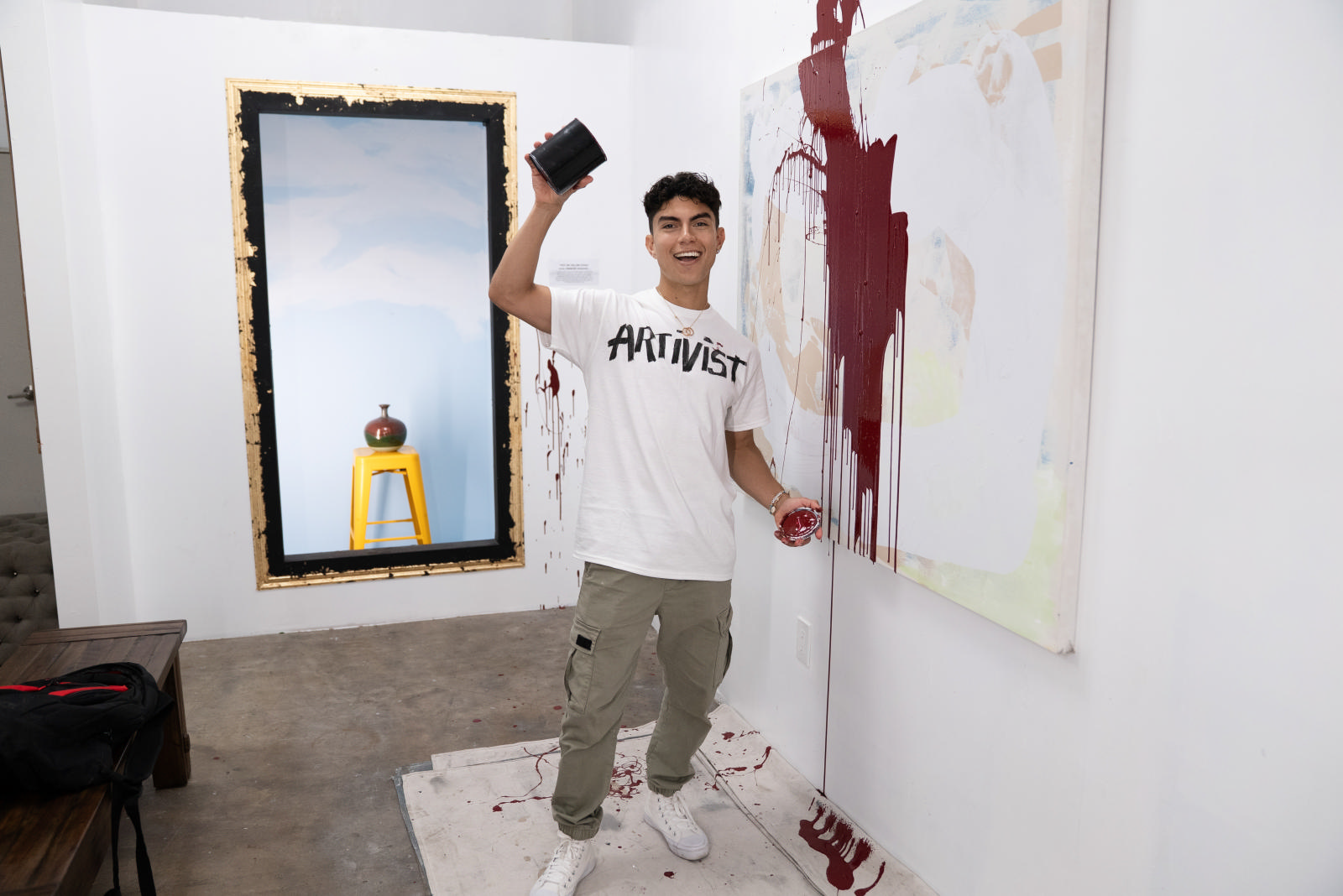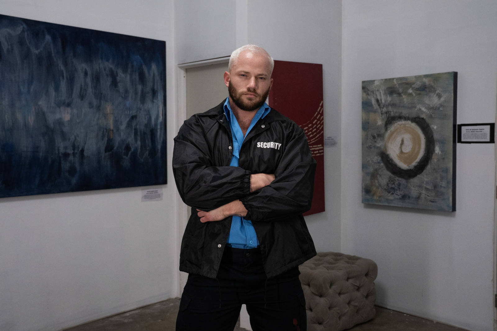 « Artivist » Alfonso Osnaya disrupts the high-brow gallery show by splashing red paint over a painting and shouting slogans at the pretentious audience. When security guard River North tries to kick him out, Alfonso glues himself to the canvas, pulling down his pants to taunt the muscular employee. River grinds against Alfonso, and the hot twink reveals he was only pretending to be stuck, so River hustles him to the security office. The guys suck each other, and River drills Alfonso against the wall and on the table. Alfonso climbs on top, riding River’s dick till he cums, and the top paints his face!