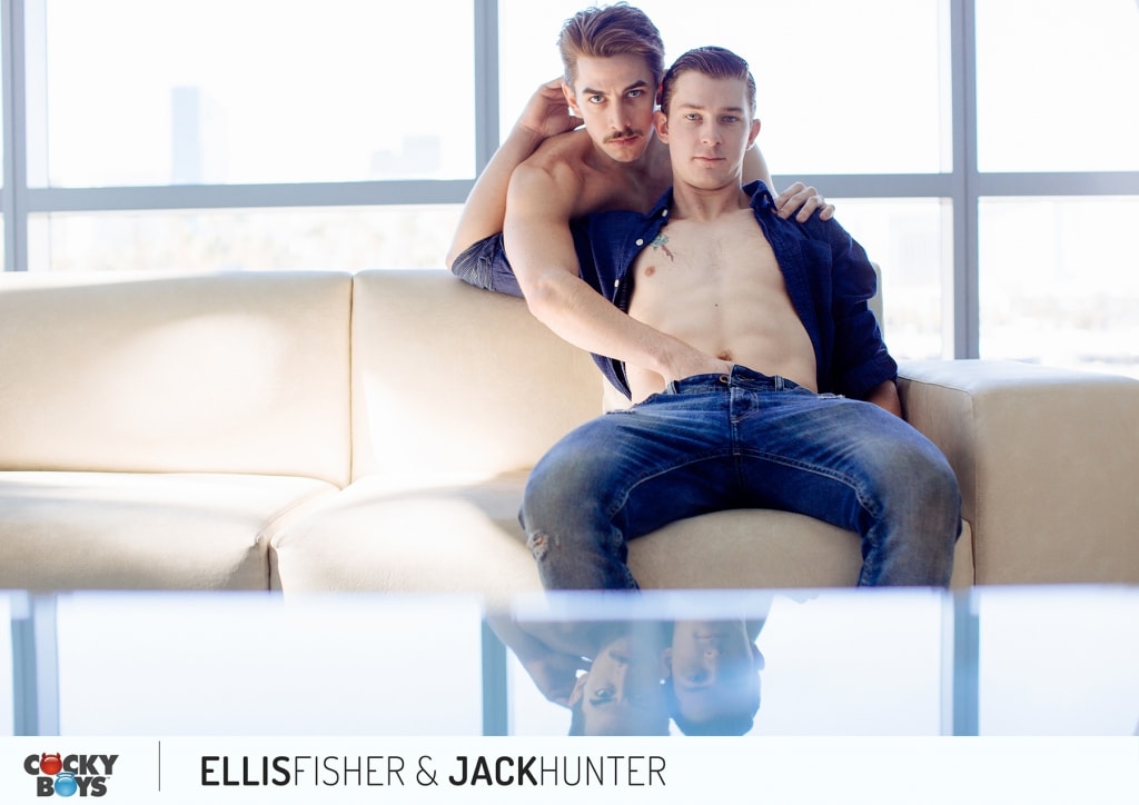 While Jack Hunter sucks Ellis Fisher, he deftly moves from handling his big balls to fingering his tight hole and making him moan louder. Ellis Fisher’ body writhes and contorts and his cock is so hard he’s wordlessly telling Jack he’s ready to be fucked. Ellis Fisher squats slowly on Jack’s cock and uses his deep-breathing techniques and bottoming experience to inch his way down and start riding him deeper & deeper. After giving Ellis leeway Jack takes a little more control and moves him up and down as he thrusts up into him in perfect sync.