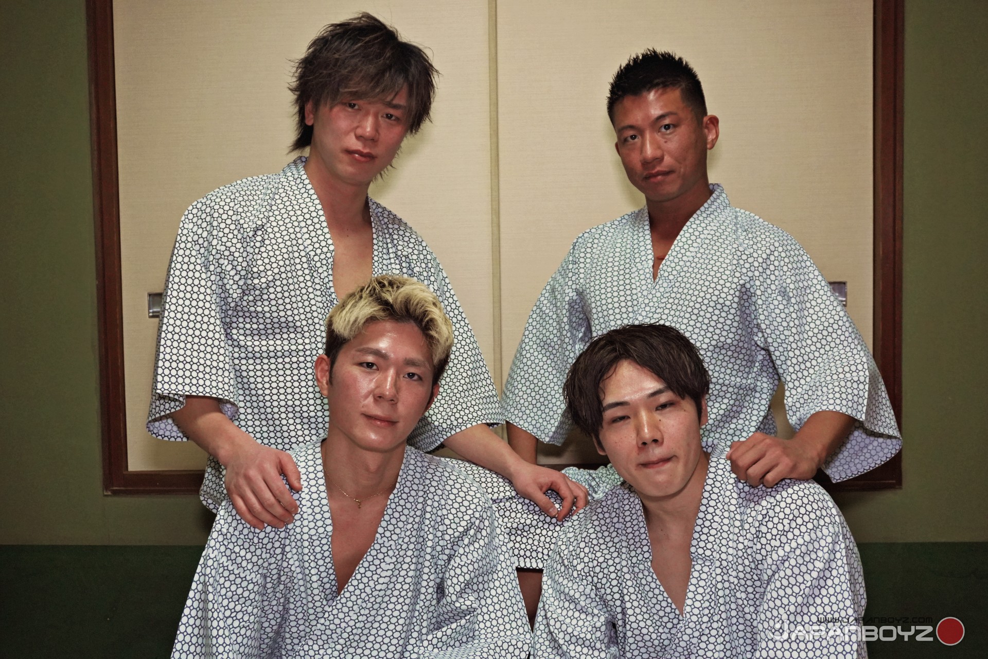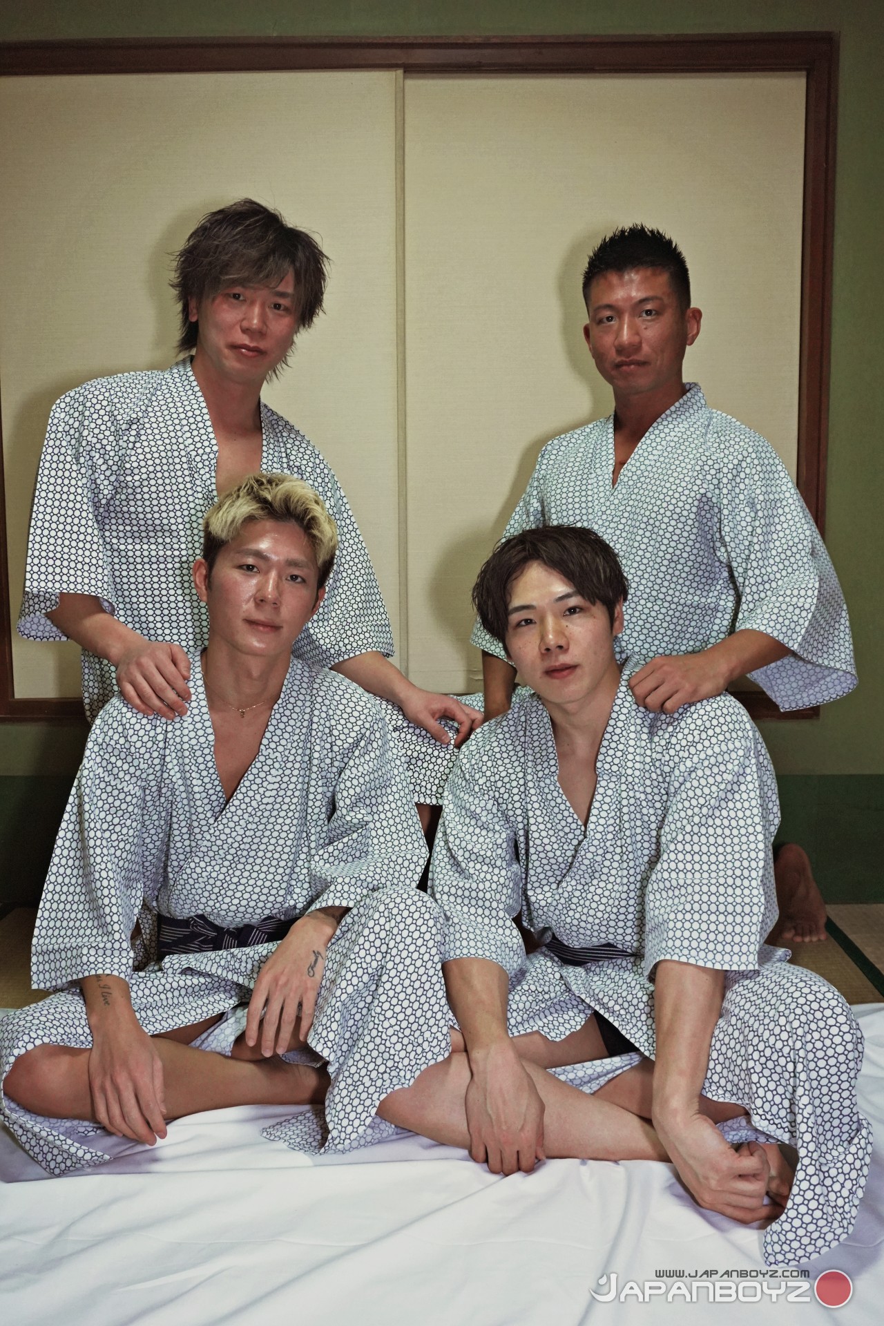 Four of the hottest guys in the Tokyo gay scene, standing around in crisp cotton belted robes with brotherly smiles across their happy faces. Reach, Ramu, Zen and Kouya are not as prim as innocent as this picture might paint…