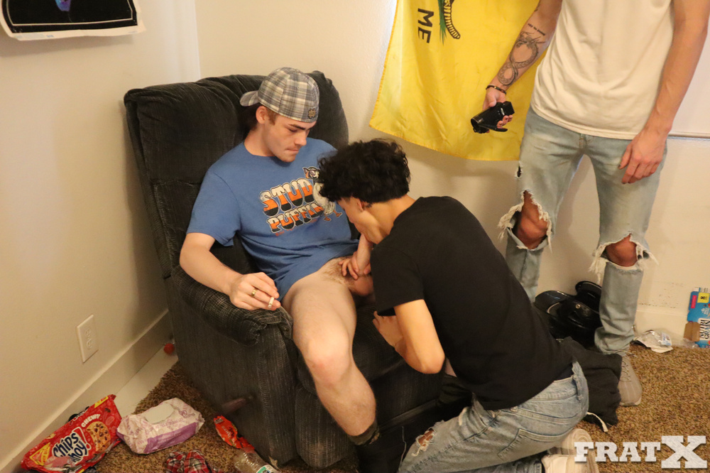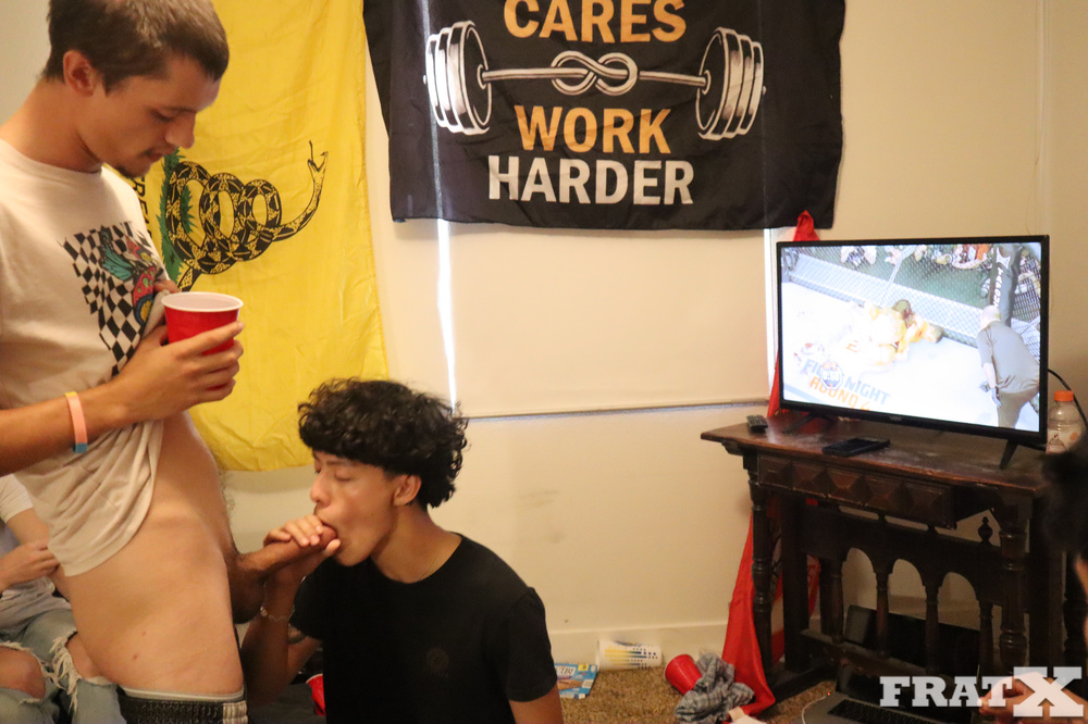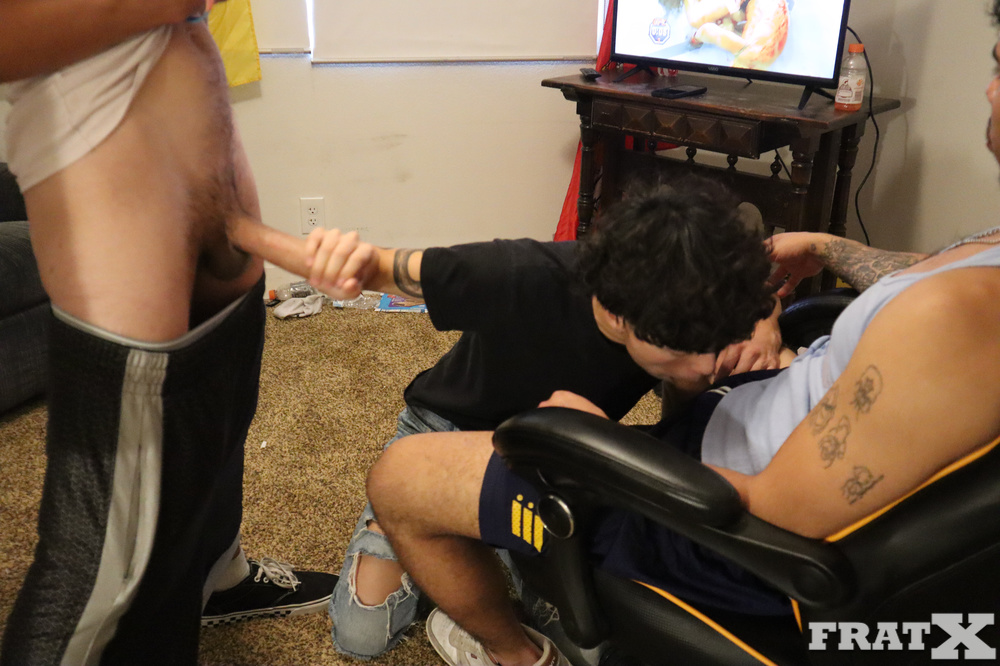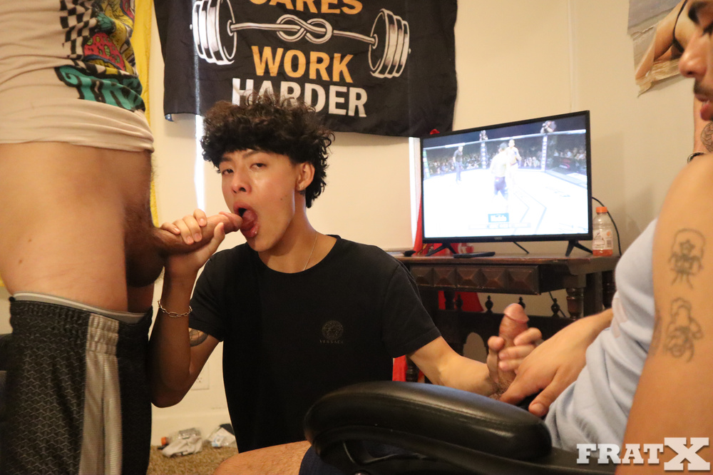 Fight night’s on, but one bro is short on rent. The brothers decide his mouth is good enough payment. He gets skull-fucked by the whole crew, then one lucky bro gets to pound his ass raw while he keeps sucking the rest. The grand finale is him on his knees, taking every last load on his face like the cum-dumpster he is.