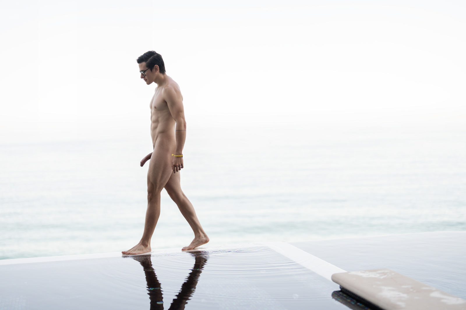Tall blond Sumner Blayne and bespectacled dark-haired Alex Gonz barely make it down the stairs to the private beach before Sumner has them both out of their swimsuits. The guys take turns sucking each other, and Sumner’s so horny he’s dripping precum, so he just has to bend Alex over on a lounger and penetrate his hole. The bottom flips over on his back for some intense missionary, then rides the top till Sumner pulls out and cums on his face. Alex makes sure to suck out every drop before lying back and jacking himself off.