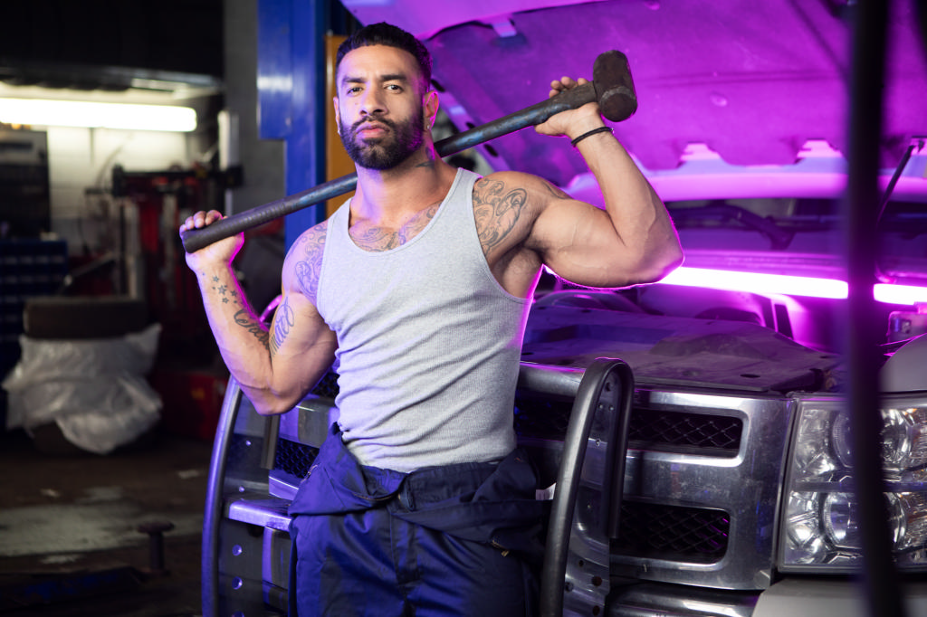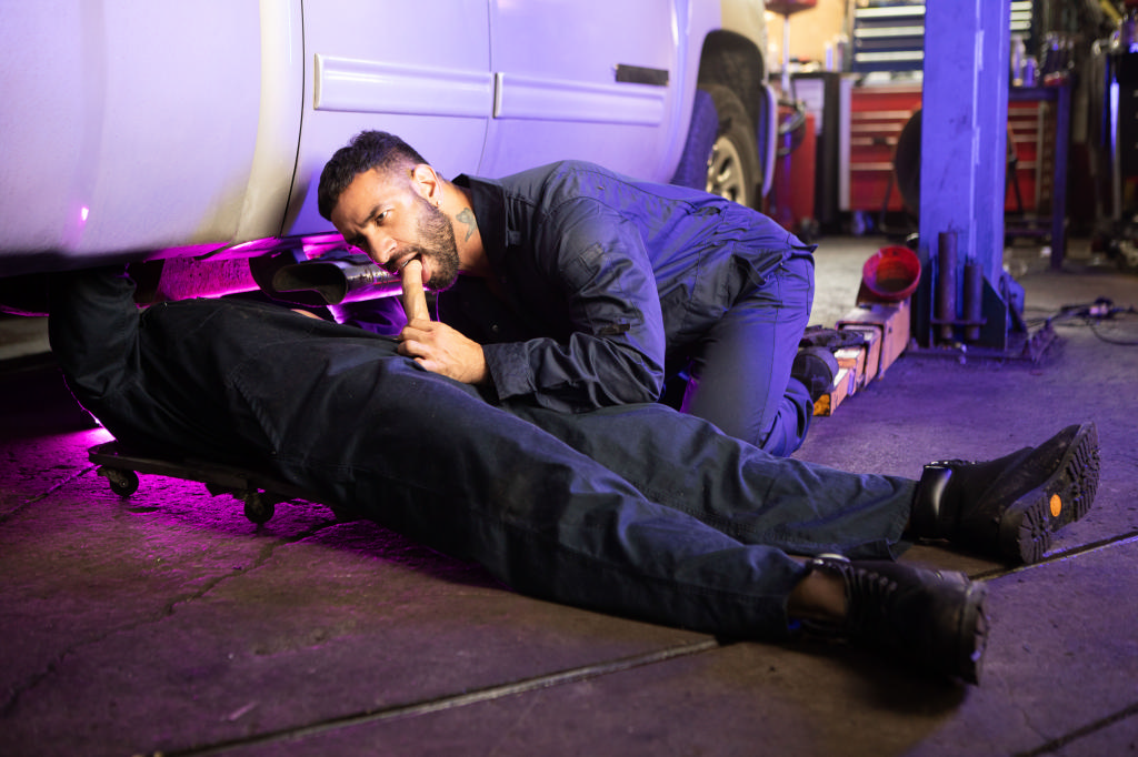 Mechanic Mateo Zagal gets distracted when Dom King asks him to pass him a wrench and he sees Dom’s big tool tenting his coveralls! While Dom’s under the truck, Mateo unzips him and sucks his dick. The top rolls out and blows Mateo, then puts him up against the side of the vehicle to eat his ass and drill that hole. Mateo rides the top, then they climb into the bed of the truck to fuck till they cum!