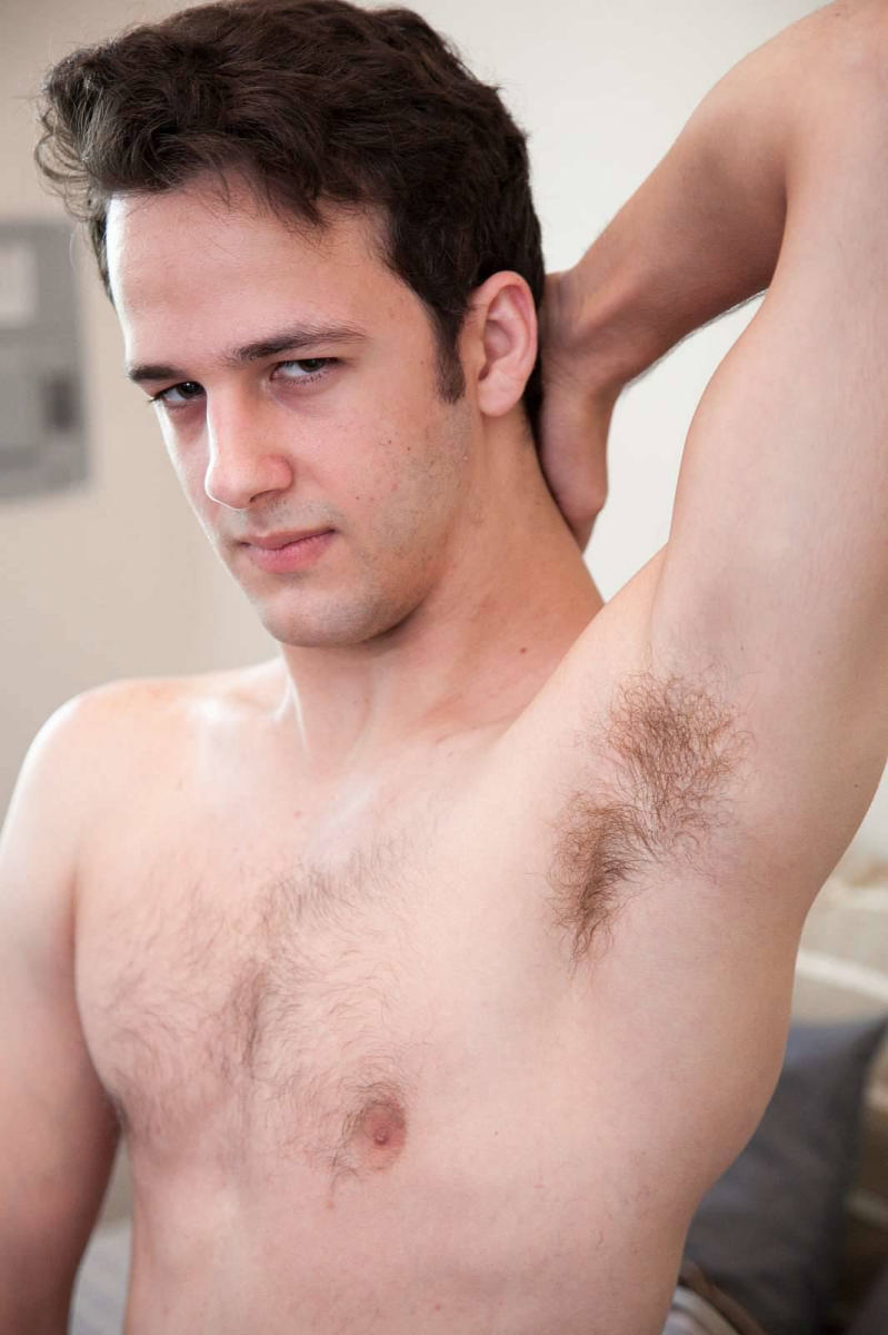 The brooding young man is sensual and inviting as he spreads his hairy legs, probably wishing YOU were there to suck him off instead of having to resort to masturbating!