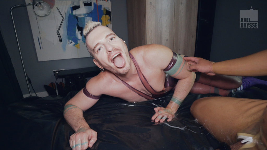Sweat drips through the translucent rubber as Axel slides into José. Soon he punches his hole, then double-fists it, while the locked dicklet squirts all over the bed.