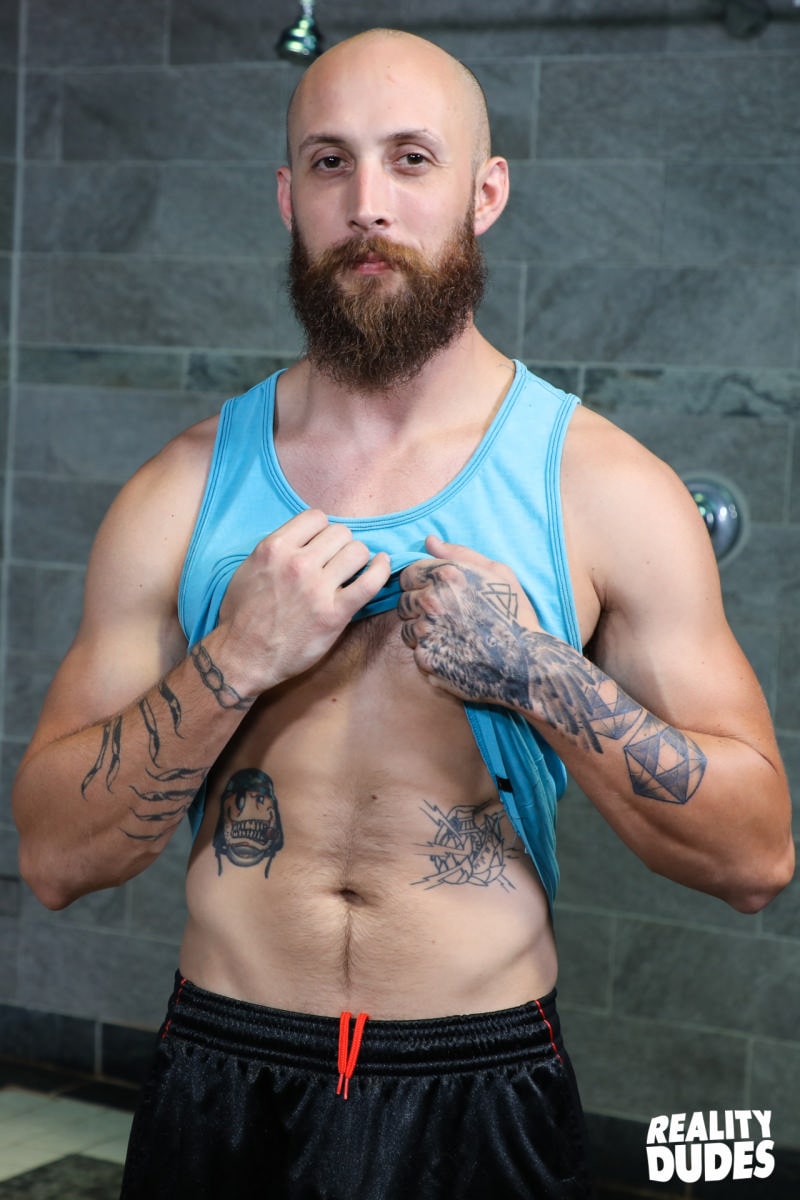 Muscular hunk Dustin Steele and buff babe Julian Knowles meet up in the locker room shower for some quick play. Tattooed Julian takes bearded Dustin’s thick rod down his throat, and Dustin follows up licking his ass, and wetting his tight hole, before slowly working his thick, raw, cock into his perfect bubble butt.
