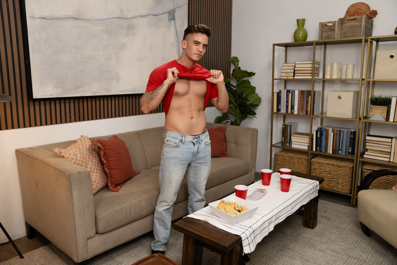 Tommy Parker can’t get enough of his stroker toy, even leaving a hangout with friends to go in his room and rub one out. Trevor Brooks knows exactly where he’s gone, and he and their pals sneak into Tommy’s room and see him with his VR headset on and the automatic toy jacking his cock! The friends laugh, but the sight makes Trevor seriously horny, so he strips down and replaces the toy with his hole. Tommy’s roommate’s ass is so good, he’s ready to switch over permanently, and Trevor sucks the top, then takes that dick on the bed in doggystyle and missionary. Tommy cums on the bottom’s face as Trevor jacks himself off.