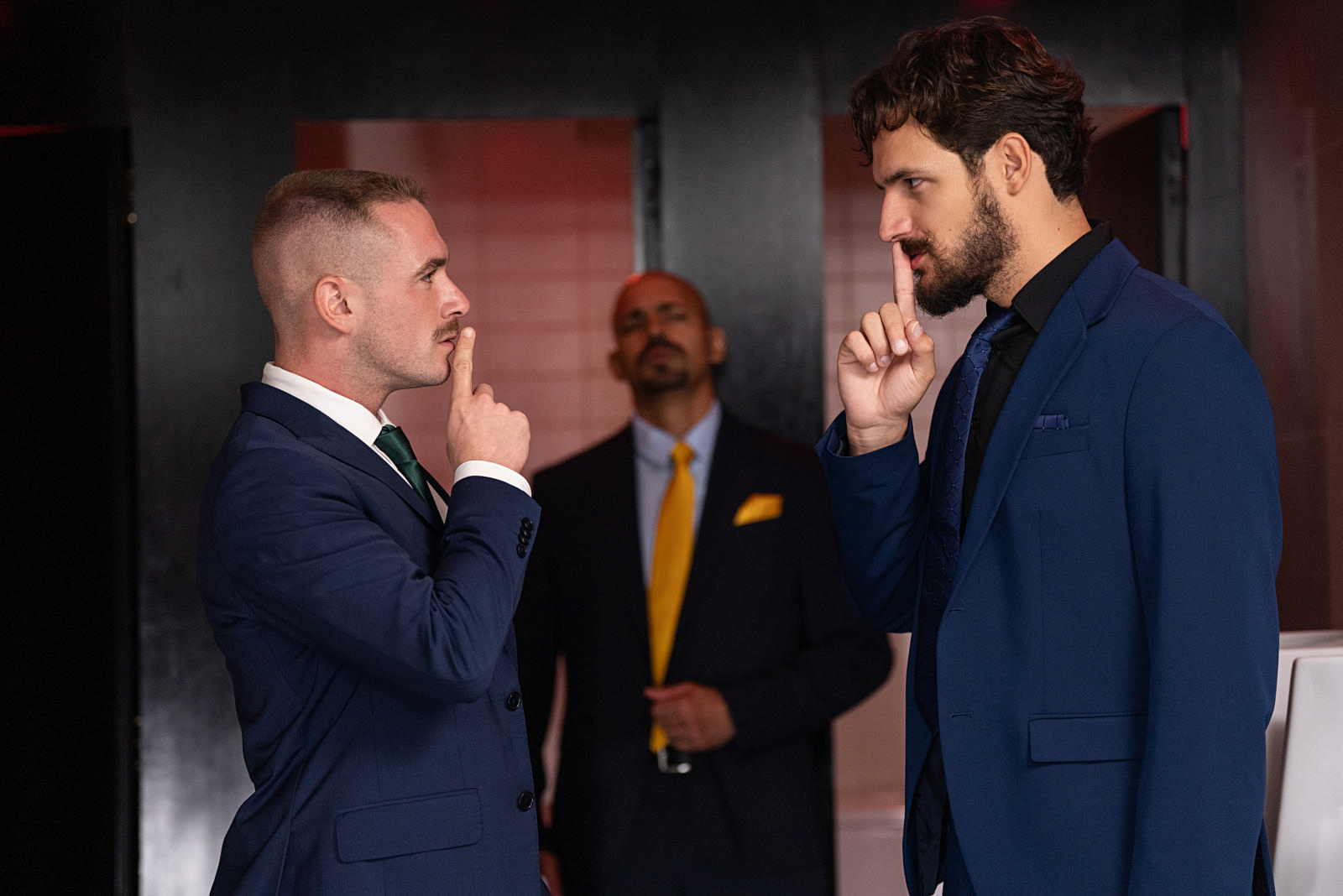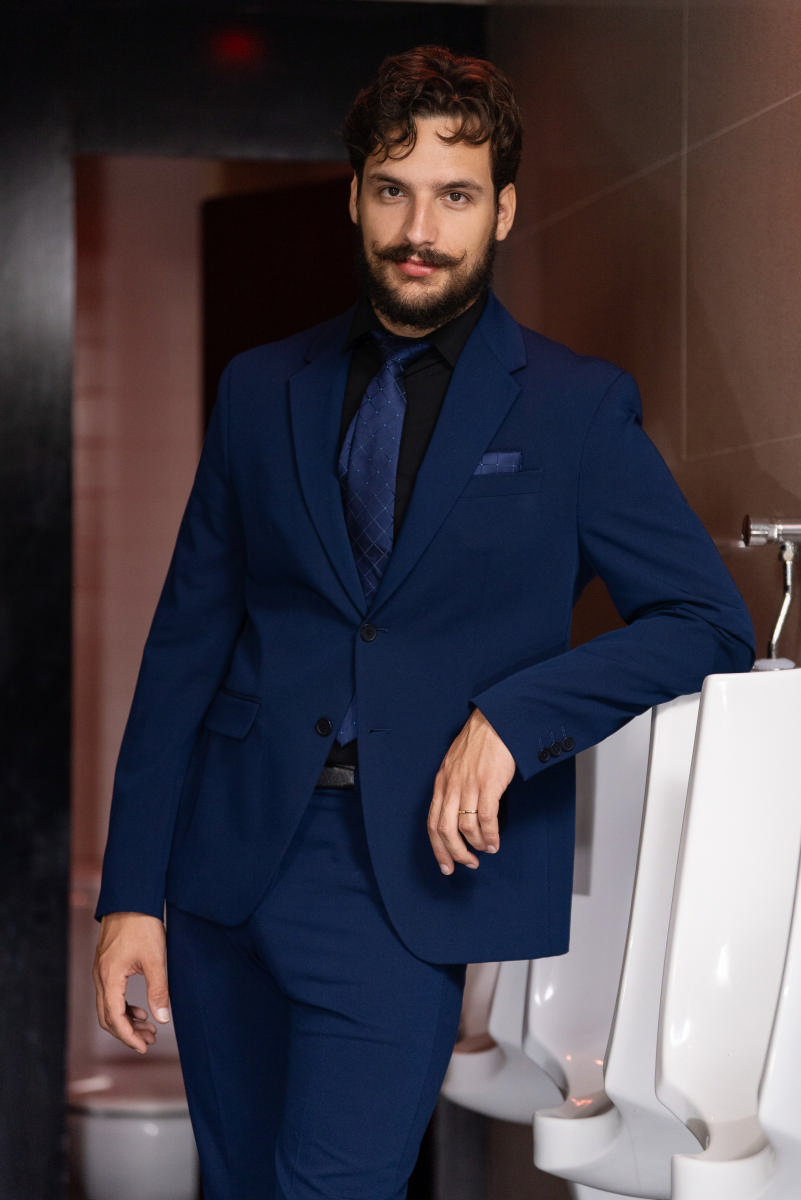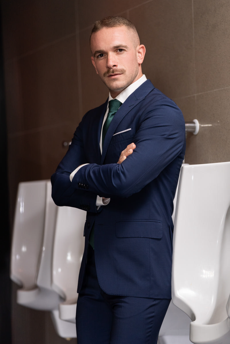 Mustached Apolo Adrii can’t stop himself from admiring his coworker Samuel Hodecker’s cock in the bathroom, till Samuel catches him looking and rubbing his bulge. No words are needed as Apolo goes into a stall and makes his invitation clear, answering the bearded man’s knock with his hard, uncut dick out. The guys stroke and suck each other, then Apolo rims the bottom and penetrates him. The guys hide in the stall, frotting, when their boss comes in, then fuck on the floor. Apolo pounds Samuel against the wall, then fucks him on his back till he orgasms before pulling out and covering him with cum. Back to work!