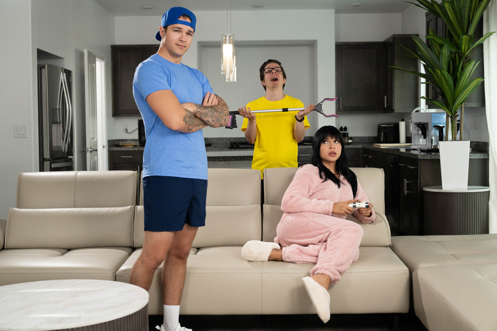 Pierced hottie Antonella Morena is really getting into her video game. She is having so much fun that she even begins using the remote controller to pleasure herself! Unbeknownst to Antonella, her stepbrother’s hunky friend (Jayden Marcos) is watching her. Aroused by the sight of the gorgeous tgirl, Jayden feeds her his meaty dick, which she swallows up in a sexy blowjob, and then Antonella sticks out her perfect ass and invites the tall, muscular stud to tongue her eager hole! Ready for a good hard fucking, the big-boobed trans babe spreads her legs and takes a missionary-style pounding before straddling Jayden and riding him in cowgirl and reverse. Nearing climax, Jayden penetrates the raven-haired stunner from behind in doggy position until it’s time to cum all over her pretty face!