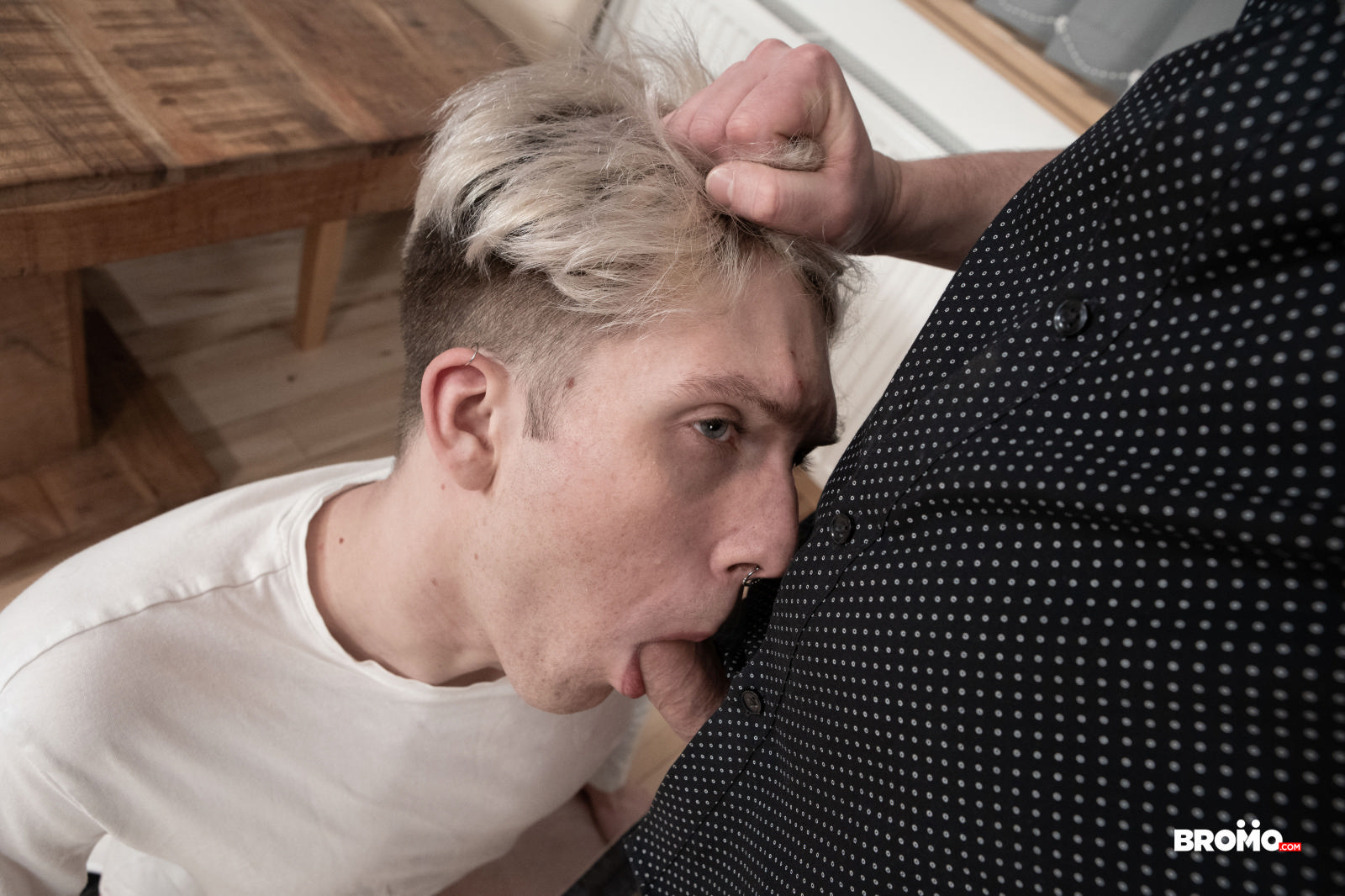 Horny top John D spots blond twink Filipe resting his head on the table with his ass hanging halfway out of his pants, and he wants to see the other half! Filipe looks up to catch John stroking his cock, and the dominant top bends him over the table, licking and kissing his juicy booty before spanking and biting it. John feeds Filipe his dick, then sucks the bottom’s hard cock before ripping open his shirt and fucking his hole doggystyle. Filipe lies on his back as he gets penetrated, then John joins him on the table to fuck him spoon till they both cum!