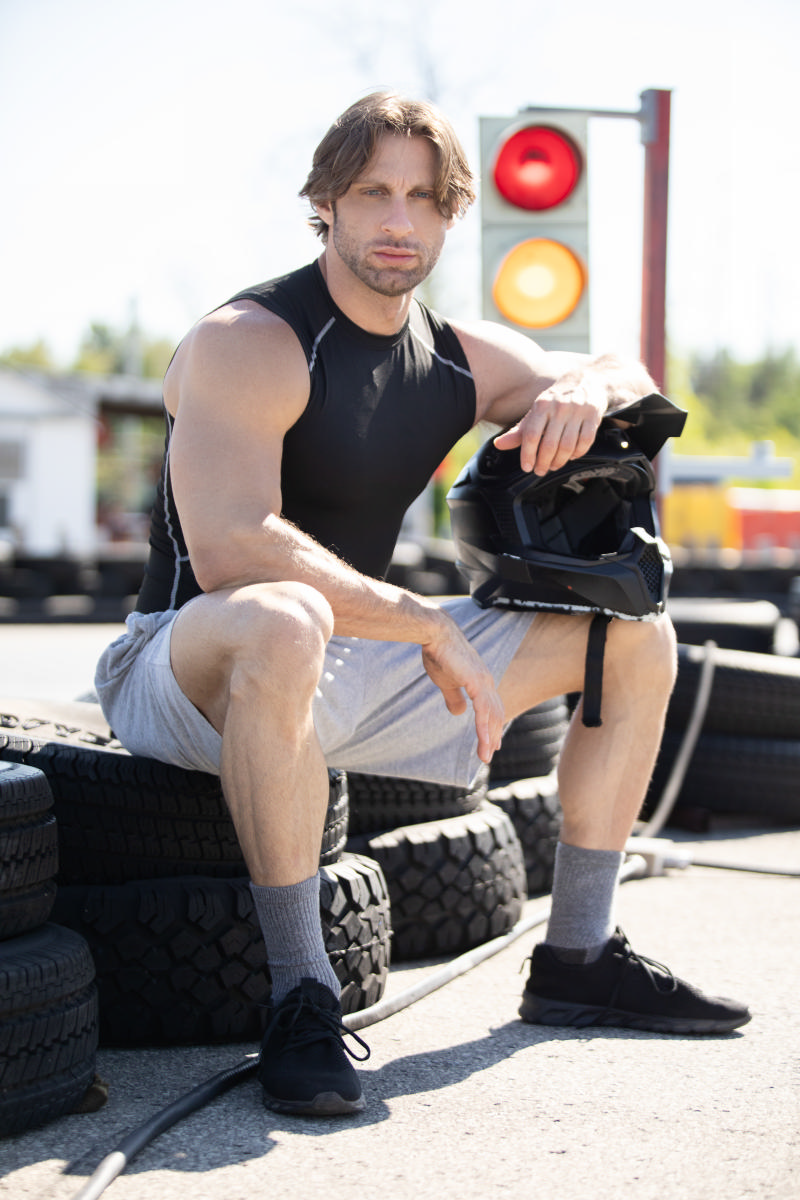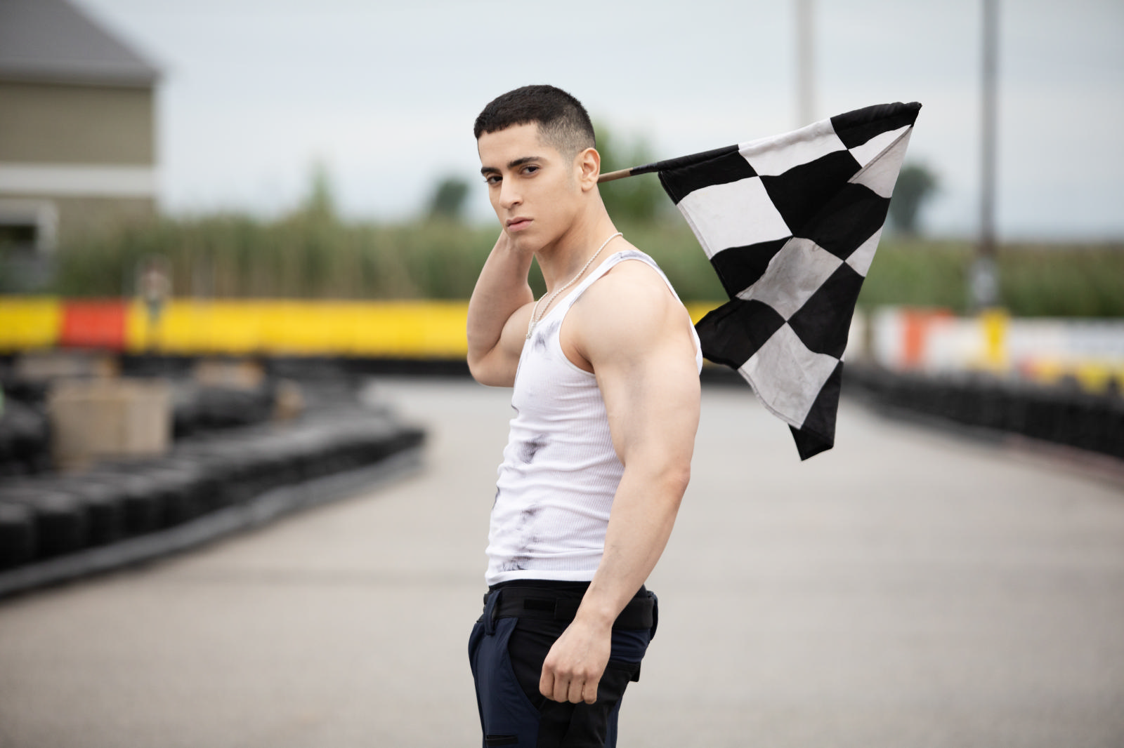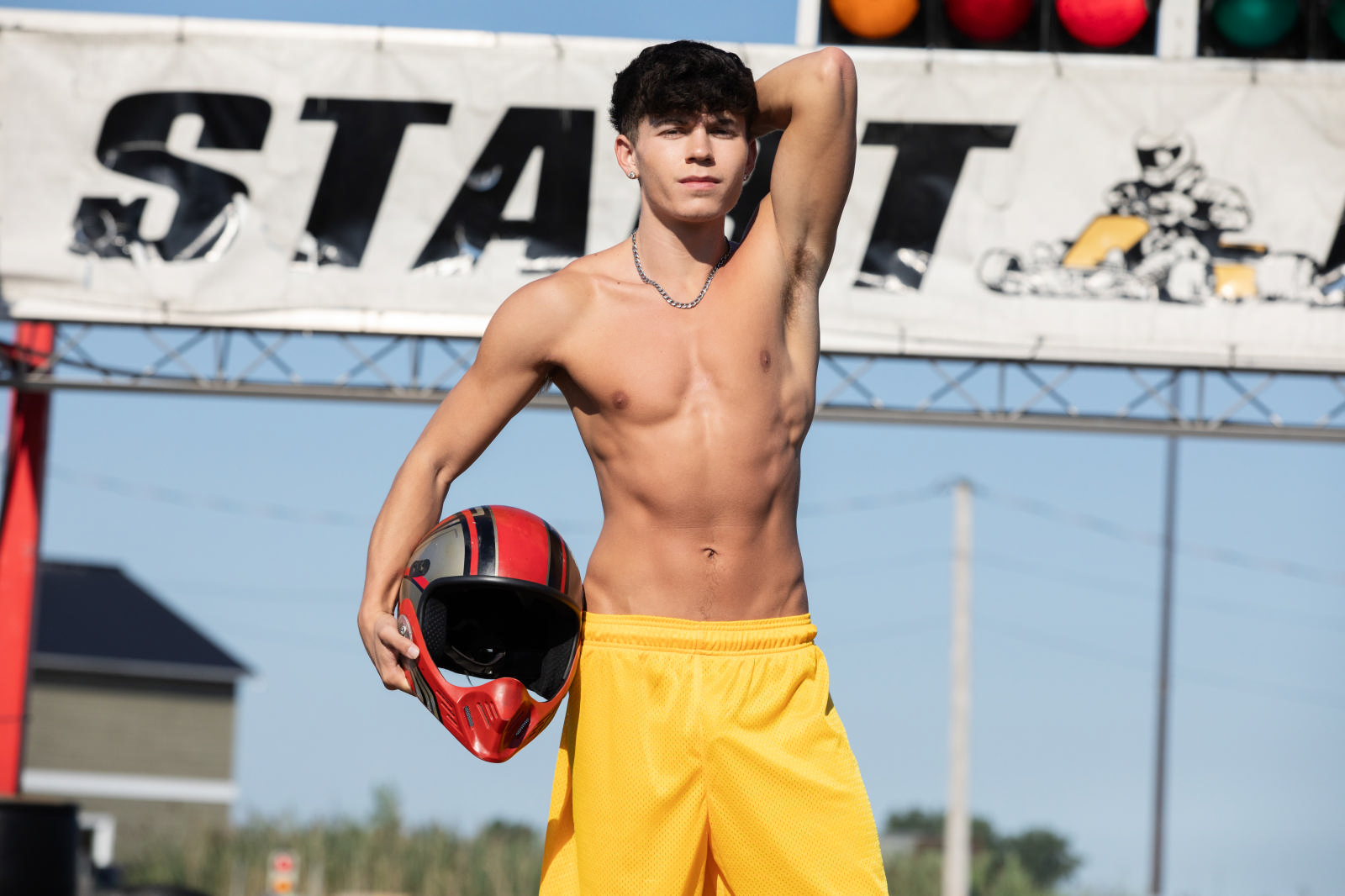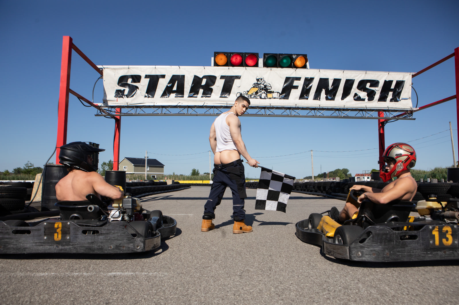 Drake Von and Dom King are ready to take each other on at the go-kart track. When they see hot employee Evan Peix bent over with his crack showing, they want to take him on, and Evan is happy to oblige. After Evan waves the checkered flag to end their race, the guys chase him down and hoist him up, carrying him right to the bedroom. Drake and Dom inform Evan he’s bottoming today, so he eagerly gets to work sucking them before they take turns licking and fucking his hole. The guys spit-roast the eager bottom, and Evan’s ready to take two cocks at once in a hot DP before both tops cum on his face!