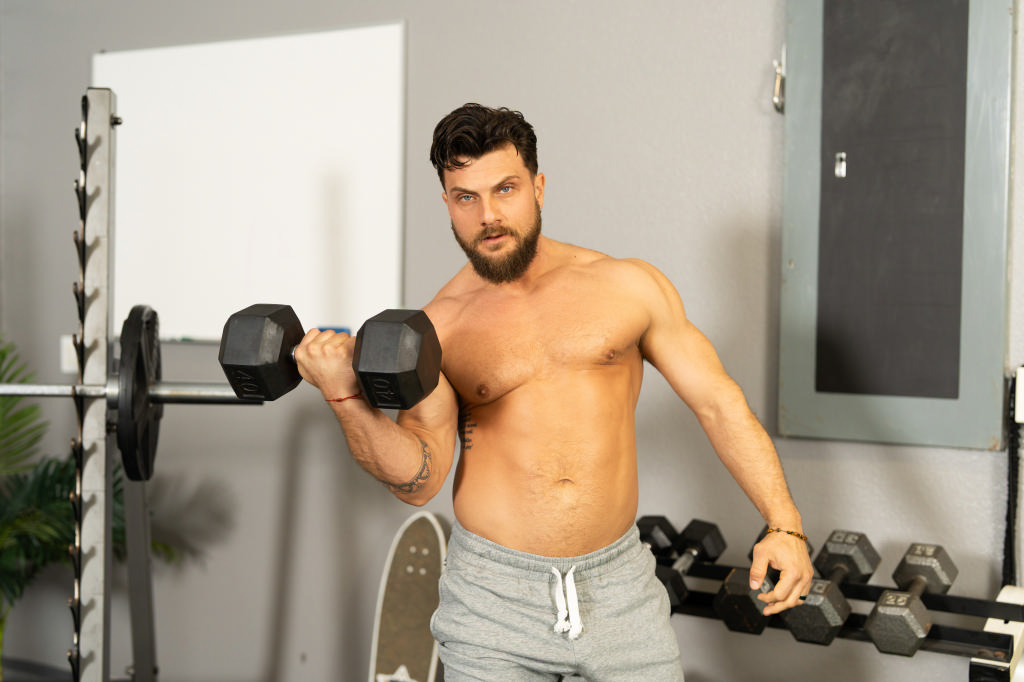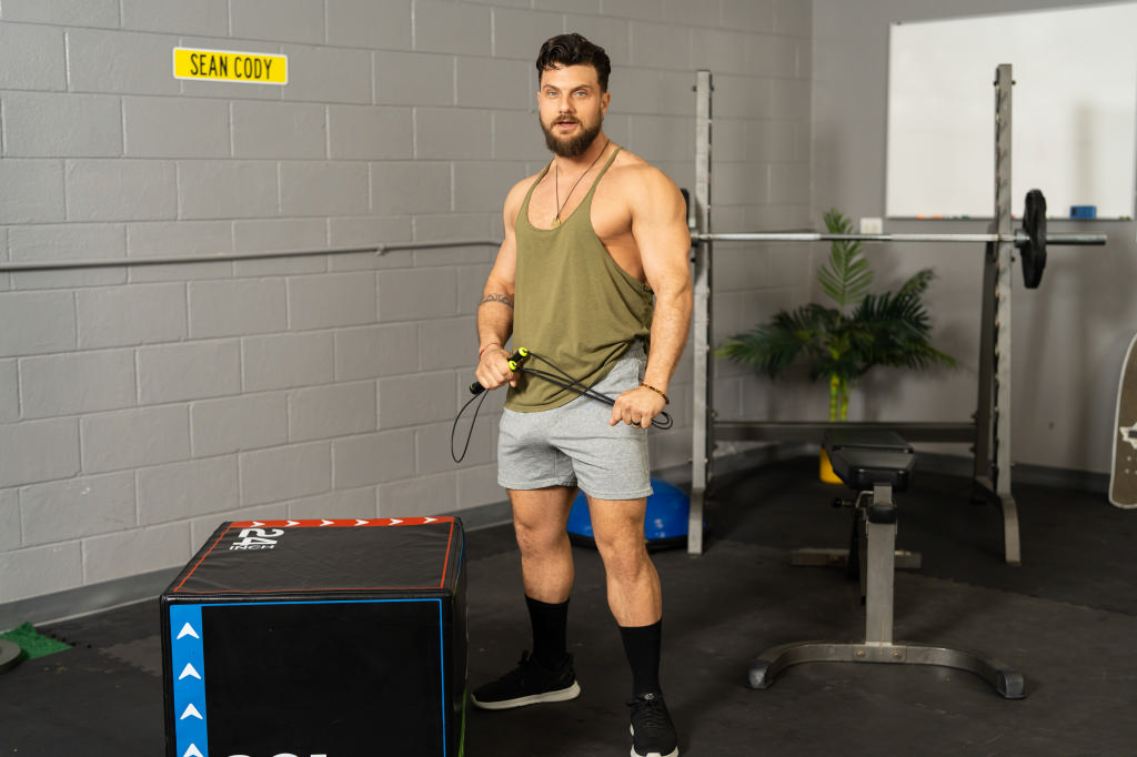 As River’s bent over to stretch, Heath checks out his ass while he jumps rope. The guys start eyeing each other’s muscled bodies, and Heath makes the first move, coming over to kiss the shaven-headed hunk. River gets on his knees to suck the bearded top, and Heath fucks his throat before rimming him and penetrating him from behind. River rides Heath on the floor, then tops him on his back as the guys flip fuck. River fucks the bearded hunk doggystyle till Heath orgasms, then cums on his face.