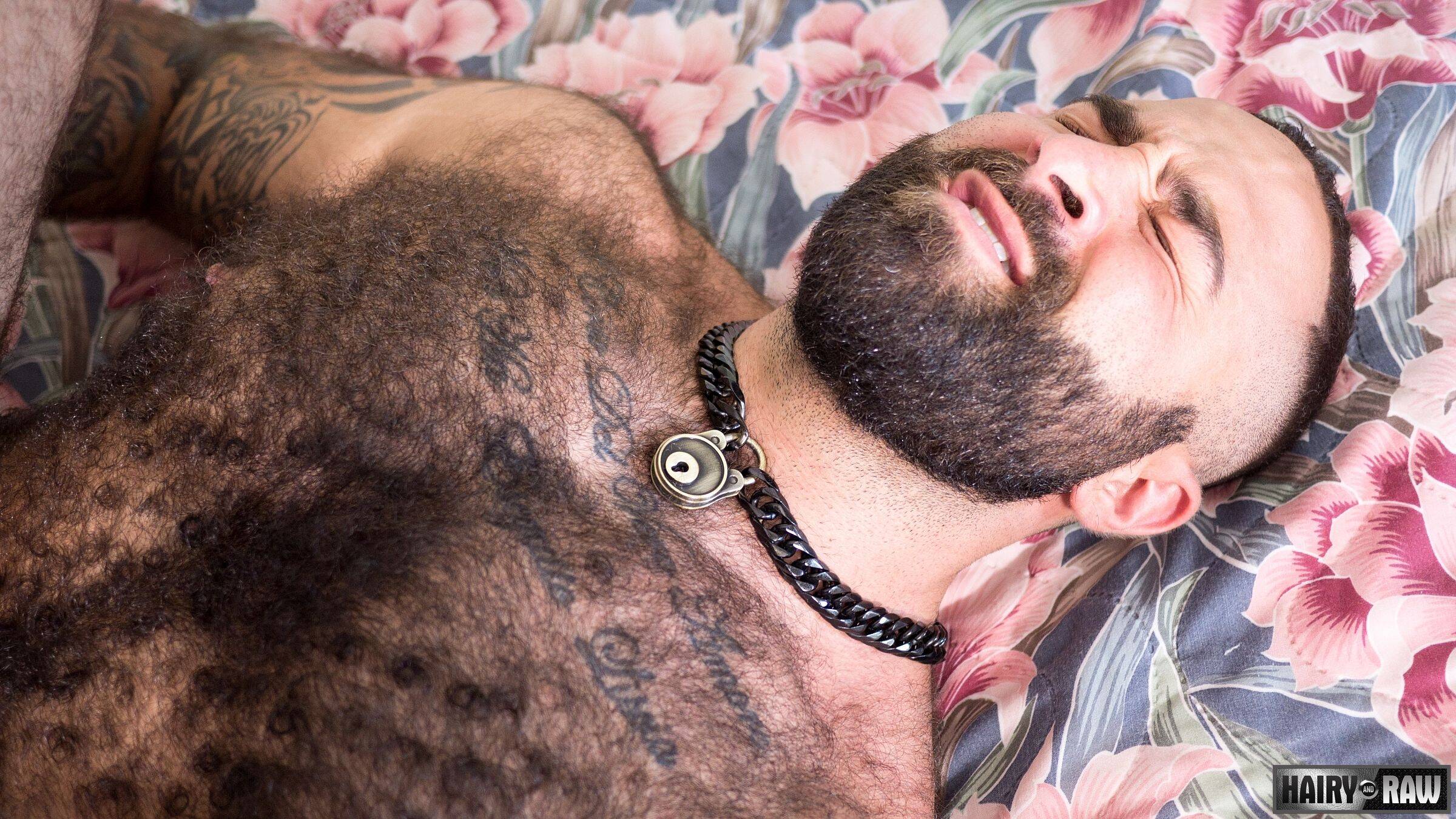 Whether you’ re into bearded ginger men or just bearded men who are as hairy as a wooly mammoth, you’ re going to spew when you see Russell Tyler and tattooed, dark-haired muscle bear Atlas Grant. These are two extremely hairy fuckers! Atlas is quick to drop to his knees, anxious to slobber and drool all over Russell’ s big dick, choking and gagging as Russell fucks his face. The tall redhead, with almost as much hair on his body as Atlas, then turns rimming into an art form. Or perhaps he’ s simply mesmerized by all that hair covering every inch of Atlas’ s body. Russell soon finds himself in the same position, on all fours, experiencing Atlas give him a good tongue fucking but it’ s Atlas who gets his hairy ass mounted and pounded raw by the barebacking ginger. And it’ s quite a fuck! Russell goes in nice and easy but once he’ s in he takes ownership of hirsute Atlas, making him cry out in lustful pleasure-pain as he fucks that meaty round ass. Atlas takes as much fucking as he can before flipping Russell, spit-lubing his ass, and sliding home like a hot knife through butter. The two continue to flip fuck and end up completely drenched in their own sweat, the hair on their bellies coated in huge loads of cum.