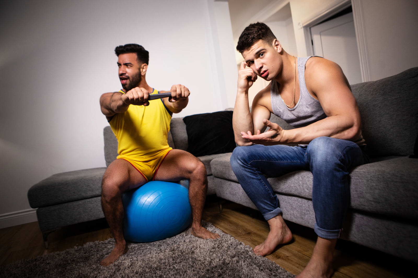 When his roommate Mateo Zagal’s Sexercise workout interferes with his game, Malik Delgaty is annoyed, but not as annoyed as when Mateo strips off all his clothes and waves his dick around as he sexercises all over the house! Mateo is angling for a workout partner, so Malik finally gives him what he wants, carrying him to the bed and spanking his ass before feeding Mateo his dick. Malik fucks the bottom doggystyle, then lies back to let Mateo get his sweat on as he rides him. Malik gets his own workout as he fucks Mateo hard, working his arms as he strokes the bottom’s dick till Mateo orgasms, then cumming in the bottom’s mouth.
