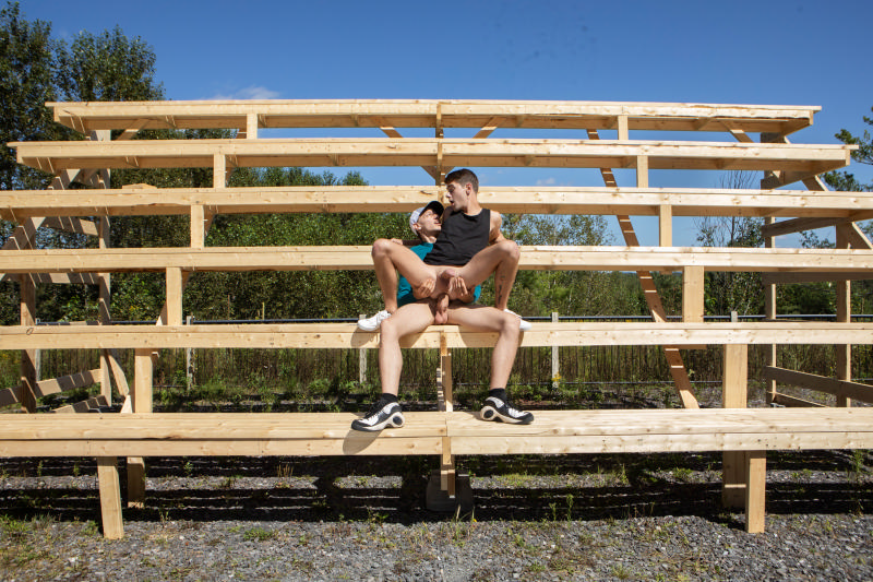 Leo Louis and his buddy are hanging out on the bleachers chatting about how they’re going to get out of their small town, and their friend Joey Mills is late, as usual. When Joey sees hung Leo sitting on the bleachers, he sneaks underneath to pull the top’s big cock out of his shorts and suck him as Leo tries to act natural. Once Joey climbs onto the bleachers, Leo surreptitiously pulls the bottom’s shorts down and fucks him! Their friend sees their naughty fun and leaves, so Leo’s free to rim Joey. The twink rides that big dick and Leo pounds him from under the bleachers till he cums, then shoots in Joey’s mouth.