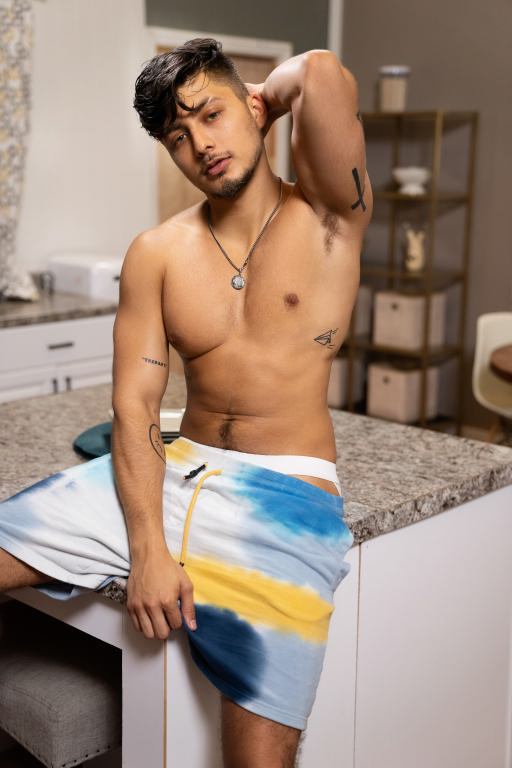 Horny bottom Angel Rivera has been waiting for his roommate to leave so he can have a little « me time. » As soon as Brysen’s out the door, Angel hurries to his sex toy drawer and fucks himself with his favorite dildo… not realizing Brysen forgot something. The top hears Angel’s moans and sneaks closer to eavesdrop, then decides to give the bottom a scare, but he gets a surprise of his own when the startled Angel launches the dildo right into his face! Brysen feeds Angel his cock, and Angel rides his roommate, then takes a doggystyle pounding. Then it’s Brysen’s turn to get drilled bent over the counter, and he continues the flip fuck, taking Angel’s cock in missionary till he cums and sucking out Angel’s hot load!