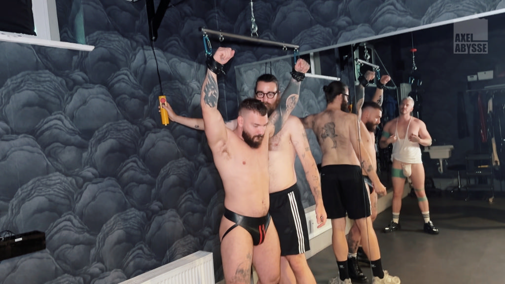 Hung from the ceiling, the pigs Kinkoer and Axel submit to Sir Joshua for deep-throat training. Gagging as they face off, they compete to see who can swallow the most.