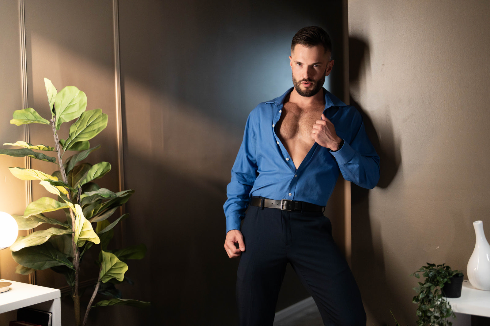 Holden Beau gets his new employee Zac Barrett settled in the office, and he realizes he’d like to see more of him, so he cranks the thermostat up to 90 and waits! It’s not long before Zac starts sweating at his desk, and Holden sneaks back to peek at the hunk with his shirt unbuttoned. When Holden catches him with his pants unzipped, Zac realizes his boss turned up the heat and why, and he’s not mad when Holden sucks his cock. Zac tongues his boss and fucks him, then Holden rides him on his new desk. Zac drills his new boss in doggystyle and on his back till both the sweaty guys cum!