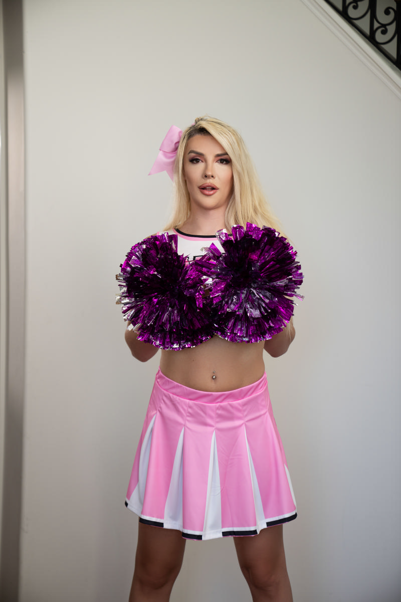 Gorgeous blonde cheerleader Leah Hayes is having fun watching the football game and hanging out with her friends, including well-endowed hunk Robby Apples! Distracted from the game, the voracious tgirl treats Robby to a sneaky blowjob in the kitchen until it’s Robby’s turn to get a taste of Leah’s rock-hard shenis. Following some incredible foreplay, the ever-horny trans babe bends over and takes a doggystyle pounding, and then Robby lubes up his dick, getting it nice and wet to slide back inside Leah again in missionary position. Afterwards, the tall, slim tgirl sucks and slurps on Robby’s cock some more before putting herself on all fours so that her sexy lover can penetrate her from behind, making her moan loudly in euphoria as his meaty dick stretches her fine ass. Flipping Leah over, Robby penetrates her tight butthole in missionary while she jerks herself to orgasm, and then the handsome stud pulls out just in time to give her a sticky facial!