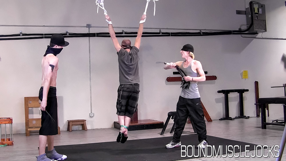 They plan to teach him a lesson, but things are soon out of control. Young thugs MC and Blaine capture Brian and drag him back to their lair, where they’re soon making use of all their tools. Blindfolded, gagged and swinging, Brian endures their swipes with the flogger and riding crop, but when he kicks back they strip him down! Swinging and with his cock and balls flopping around all over they wrap him in plastic and put him in the coffin cage, with electrodes on his cock and balls! What could they do to him next?
